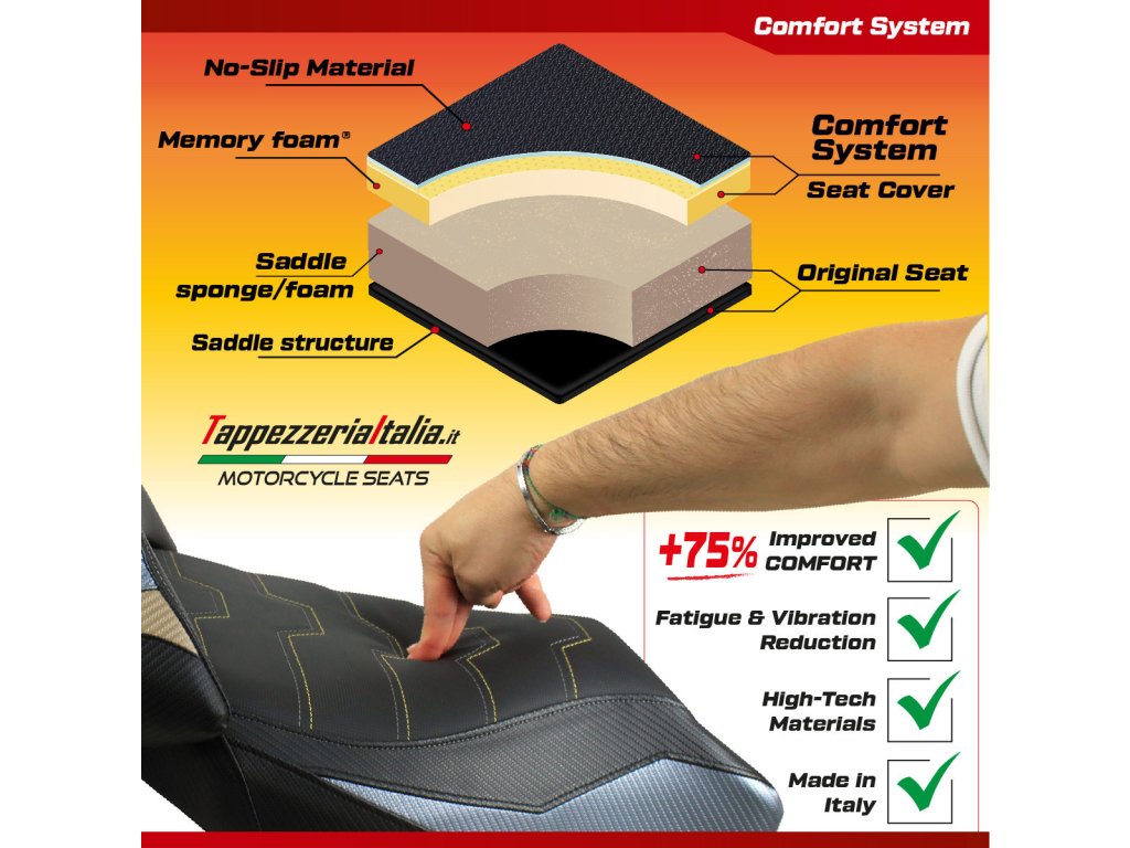- komfort je potah sedla s paměťovou pěnou (25mm) pro větší pohodlí na cestách