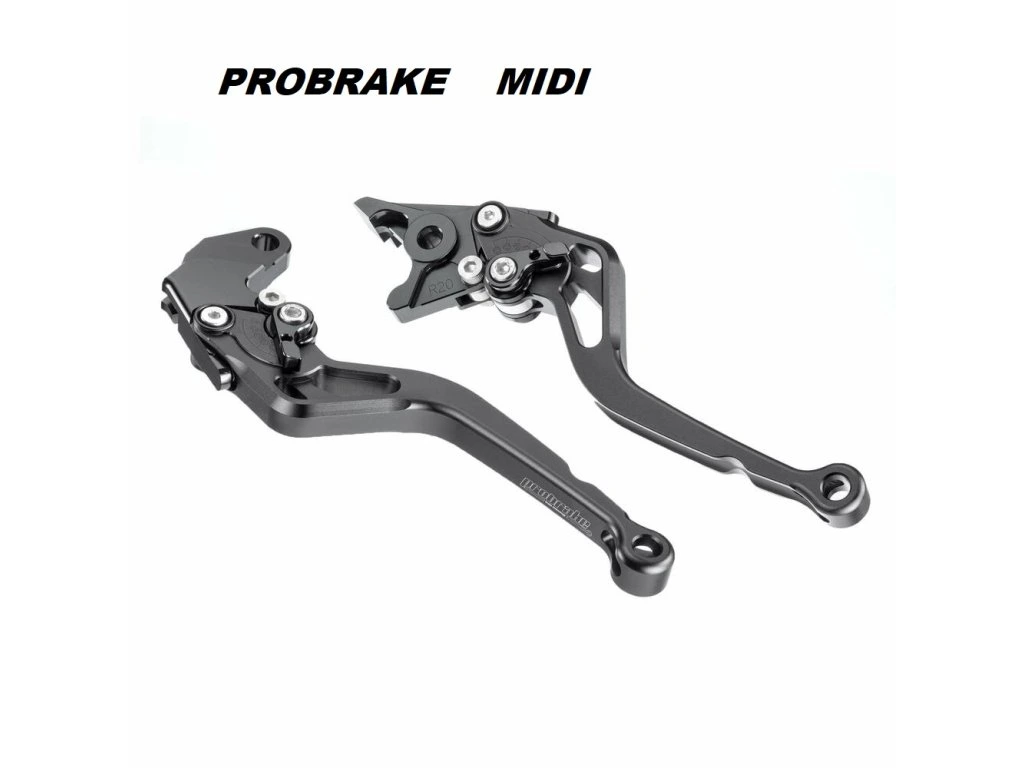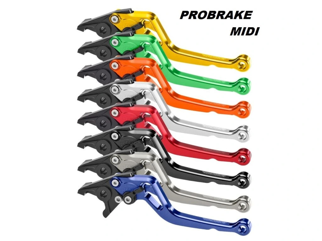 ProBrake Midi - optimální délka páček 65mm ( 2 až 4 prsty), 6 poloh vzdálenosti od rukojeti, barva páčky černá, černá matná, titan, titan matná, červená, červená matná, modrá, modrá matná, zlatá, zlatá matná, stříbrná, stříbrná matná, oranžová, oranžová matná, zelená, zelená matná. Selektory nastavení odklonu vždy černý.