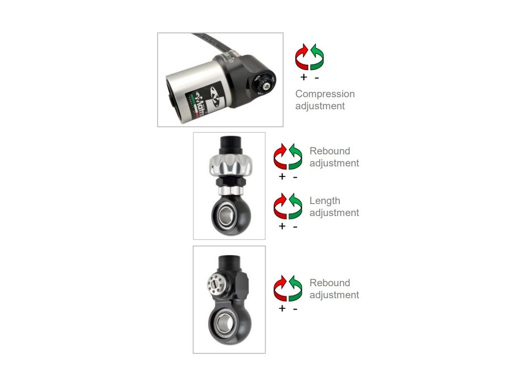 - M40D - je nastavitelná hydraulická dvojitá sada tlumičů s vnitřní tlakovou expanzní nádobou na plynný dusík (N2), Jednoduché, a snadno použitelné, nastavení tlumení odskoku, kde je to možné, je k dispozici také jednotka pro nastavení délky tlumičů
