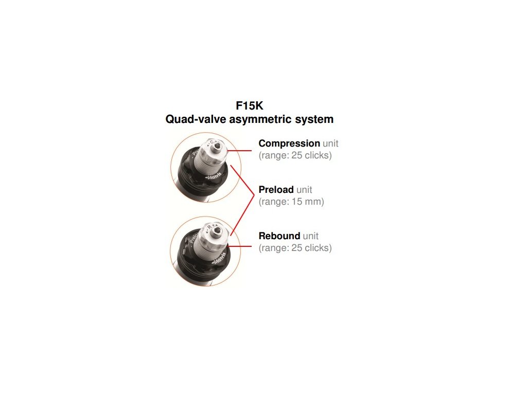 - F15K - F15K, základní kazeta se čtyřmi ventily, jedná se o asymetrickou hydraulickou kartuši, která zcela nahrazuje původní vnitřky běžných nenastavitelných vidlic a převádí je na plně nastavitelné jako u sportovní vidlice, sada určená pro všechny motocykly Street, Naked a Classic vybavená konvenčními vidlicemi, obsahuje předpětí pružiny a samostatné asymetrické nastavení tlumení komprese a odskoku pomocí inovativního „systému čtyř ventilů“, který zabraňuje riziku kavitace kapaliny, může být nastavena mnohem přesněji pro potřeby každého jezdce, díky čemuž je vidlice přesnější, lépe nastavitelná, snadněji použitelná… lepší v každém ohledu