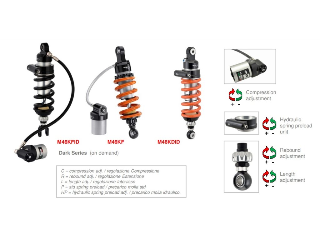 - M46KF - řada zadních tlumičů s flexibilní ovládáním je ideální pro silniční a silničně/cestovní a enduro motocykly, dvě samostatné a nezávislé řídicí jednotky hydraulického tlumení pro nastavení komprese a odskoku, nastavitelná výška tlumiče