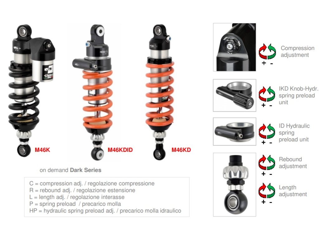 - M46KD - jednoduše nastavitelný tlumič „KD“ je určen především pro silniční motocykly, snadné nastavení pro všechny jezdce, umožňuje ovládání hydraulického tlumení, ve většině modifikací nastavení světlé výšky, standardně je zahrnuto předpětí pružiny, ale k dispozici je řada jednotek s hydraulickým předpětím pružiny, tyto tlumiče jsou vyrobeny za použití stejné kvality jako prémiové tlumiče, i když se jedná o základní produkt.