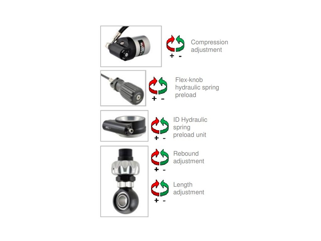 - M40D - je nastavitelná hydraulická dvojitá sada tlumičů s vnitřní tlakovou expanzní nádobou na plynný dusík (N2), Jednoduché, a snadno použitelné, nastavení tlumení odskoku, kde je to možné, je k dispozici také jednotka pro nastavení délky tlumičů
