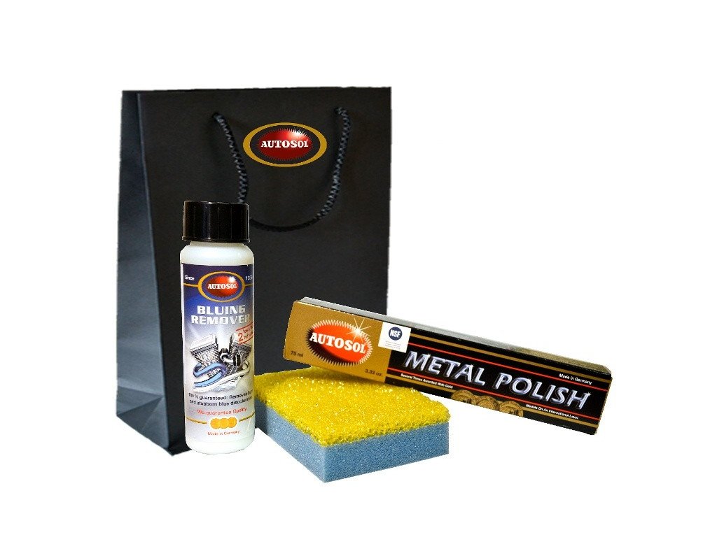 Výfuk u motorky zase jako nový i po letech bez údržby, Duo nejoblíbenějších produktů od Autosol dokáže divy se zlatavým zabarvením a připáleninami. Vyčištění a vyleštění do několika minut. Čistič výfukových svodů společně s pastou a houbičkou v jednom balení.
