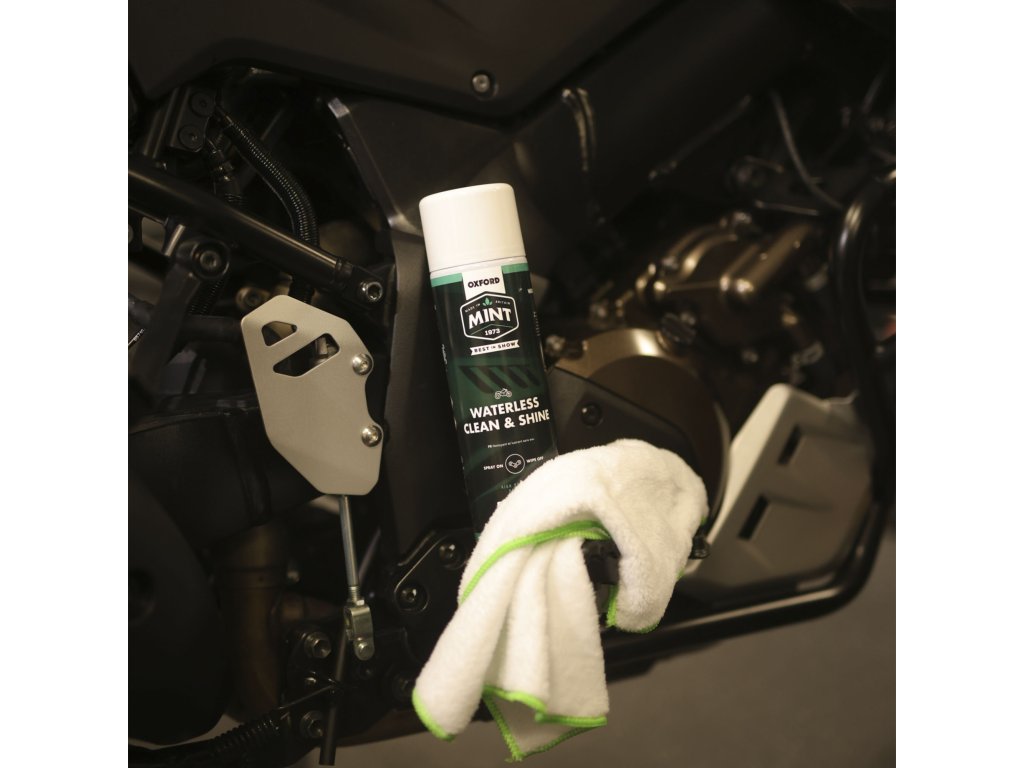 Oxford Mint Waterless Spray - pěnový čistič a leštěnka byl vyvinut pro rychlé a snadné čištění, bez potřeby vody. Pokud potřebuje váš motocykl či kolo osvěžit mezi klasickým mytím, pak je tento produkt ideální volbou. Pěnící účinek odstraní snadno prach, šmouhy a zanechá hluboký lesk jako po leštění. Jde o dokonalý čistič "vše v jednom".
