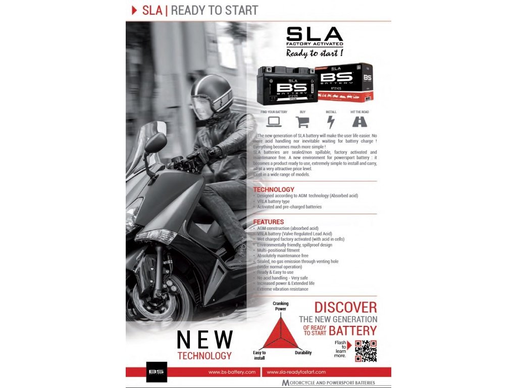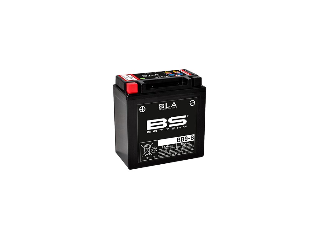 Ve výrobě aktivovaný SLA bezúdržbový akumulátor (VRLA, AGM za mokra nabitý), značení dle normy JIS YB10L-B2 (FA), 12V 10Ah startovací proud 120 A, rozměry 133x90x145mm