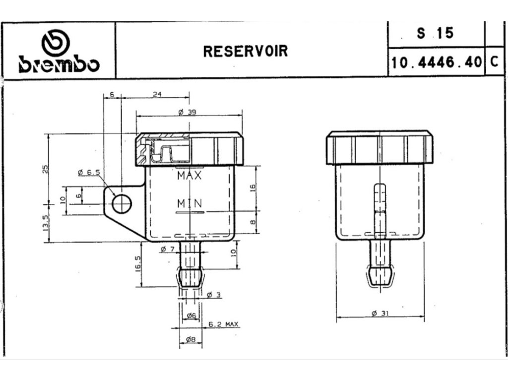 BREMBO nádobka na brzdovou/spojkovou kapalinu. Nádobka je bez hadice, doporučujeme hadici norprene Ø6.4 x 2.4 mm, nerosí se, výborná kvalita, ohebnost a životnost.