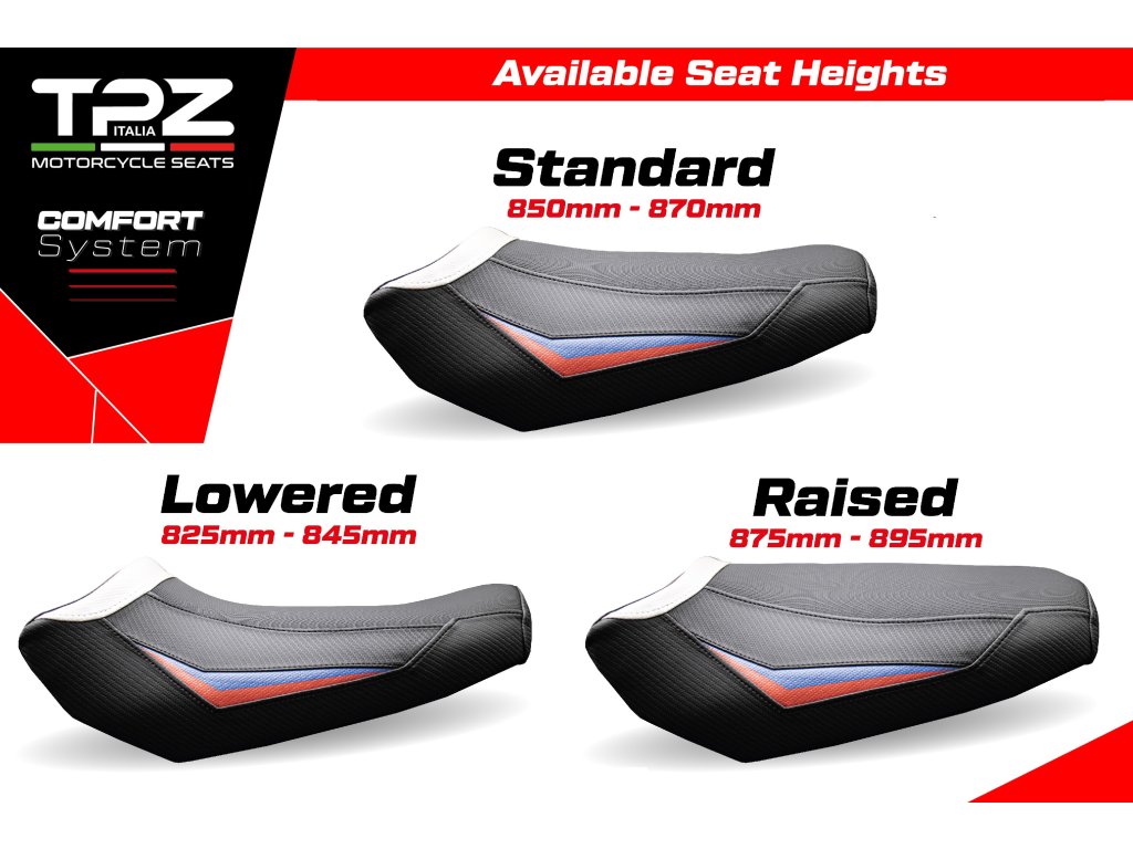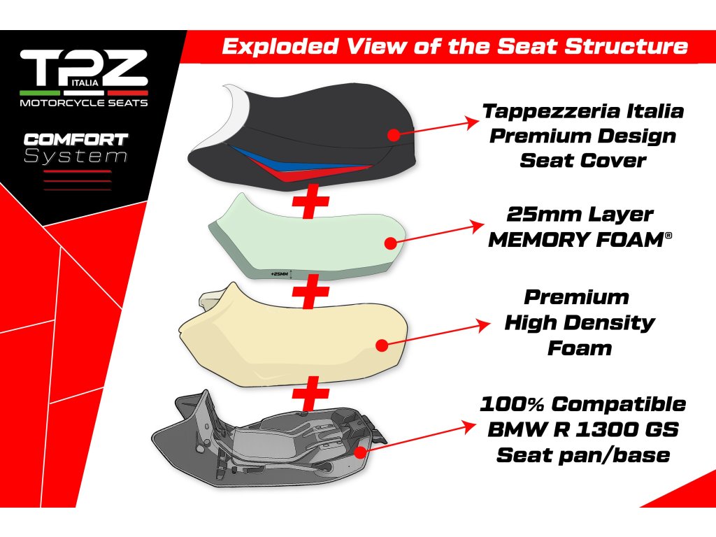 Sedlo specifikace: základna a pěnová výplň je stejná jako u originálního sedla, 100% kompatibilní uchycením a rozměry pro uvedený model motocyklu, navíc s dodatečnou vrstvou 2,5cm paměťové pěny (komfort system) a exkluzivním potahem od TAPPEZZERIA ITALIA.