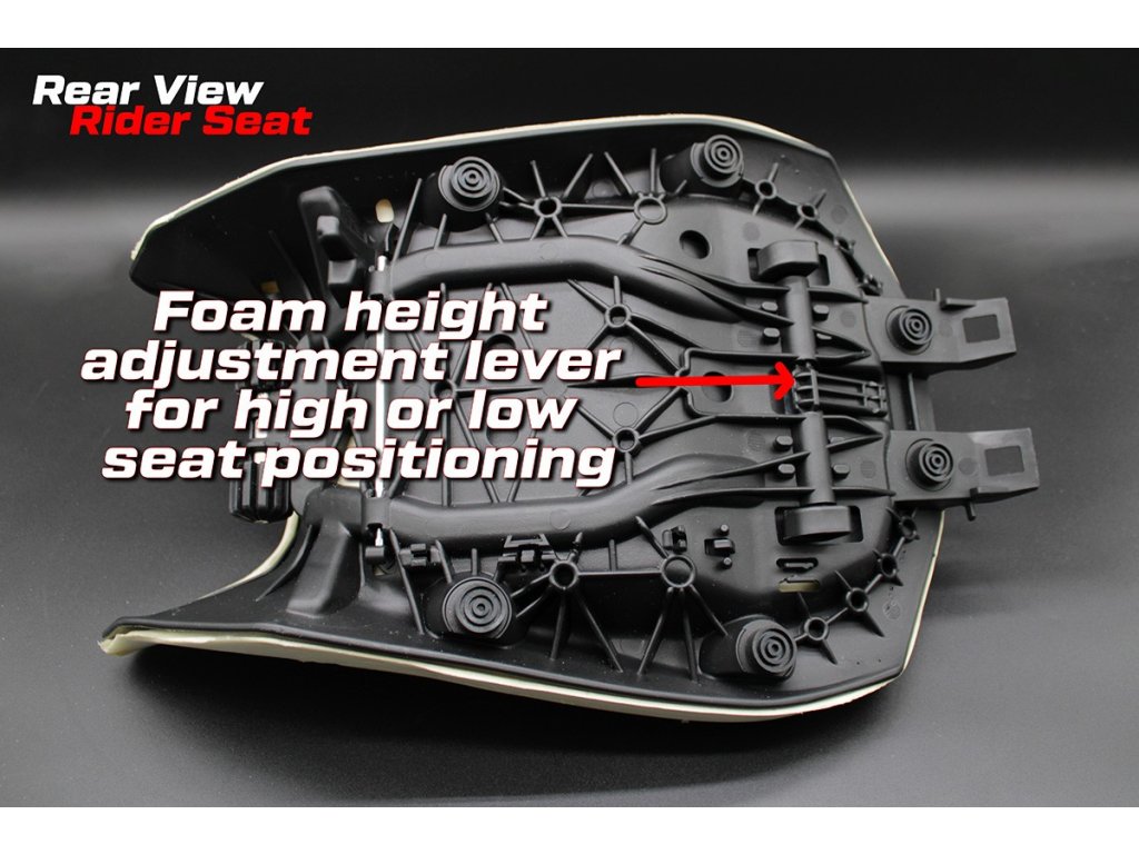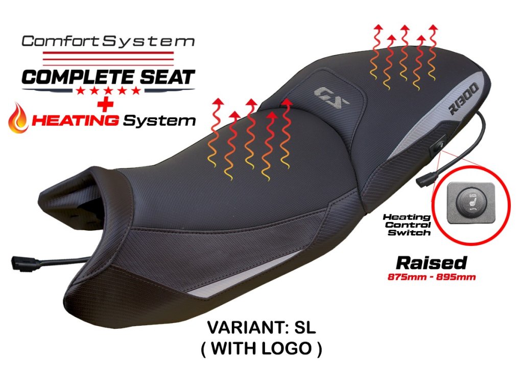 Kompletní vyhřívané zvýšené sedlo (875 mm - 895 mm od země), nastavitelné pákou pod sedlem o ±20 mm.