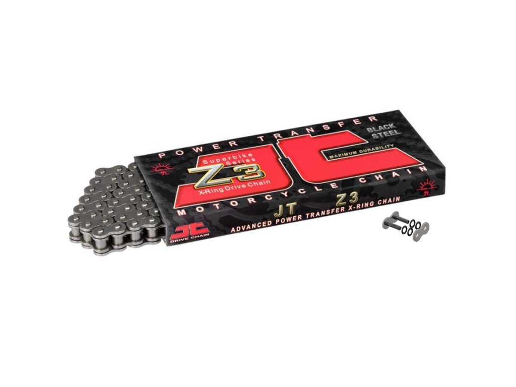 X-kroužkový řetěz typ 530Z3 anglického výrobce JT. Pevnost v tahu 46kN, váha řetězu 2,19kg/100 čepů. Řetěz určený pro motocykly do objemu 1400ccm.