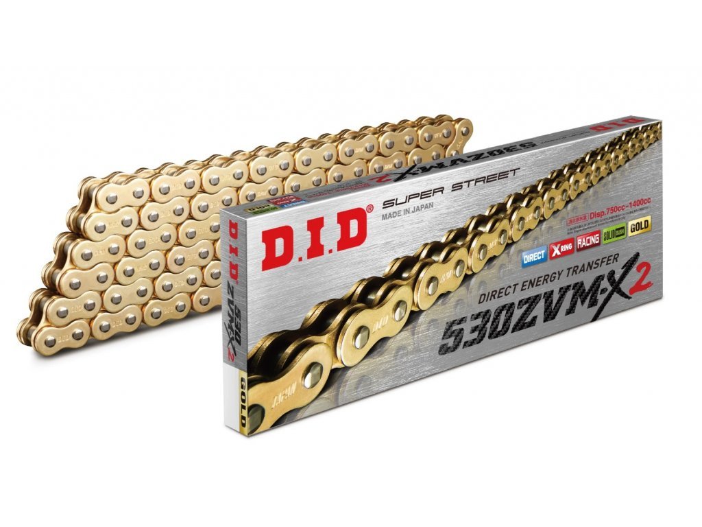 Řetěz 530 ZVMX2, X-kroužkový zesílený, celozlatý. Řetěz speciální řady Super Street X-Ring, určený pro motocykly do objemu 1400 ccm, pevnost v tahu 46,3 kN. Váha řetězu 2,20 kg/100 čepů.