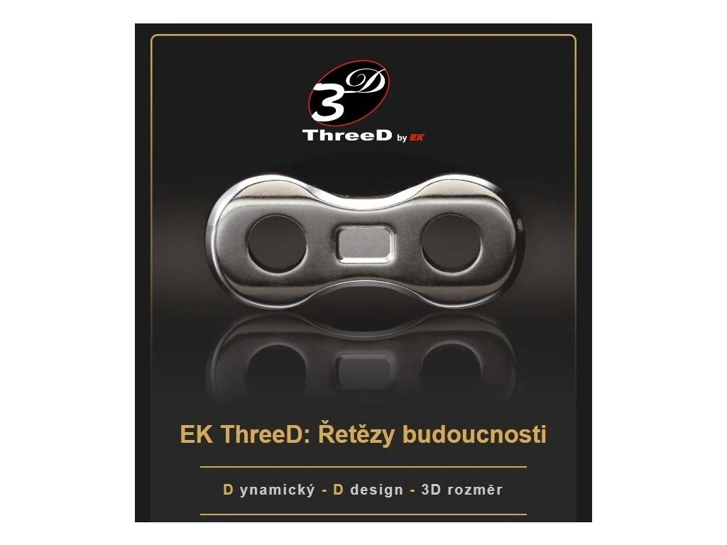 Řetěz EK ThreeD je výsledkem snahy vyrobit prémiový řetěz, který snižuje tření o 30 %, je mimořádně odolný, ale zároveň i esteticky propracovaný. Vnější destičky s elegantním zakřivením snižují hmotnost a zvyšují atraktivitu, zatímco vnitřní destičky a čepy s odlehčovacími otvory dále snižují celkovou hmotnost řetězu.