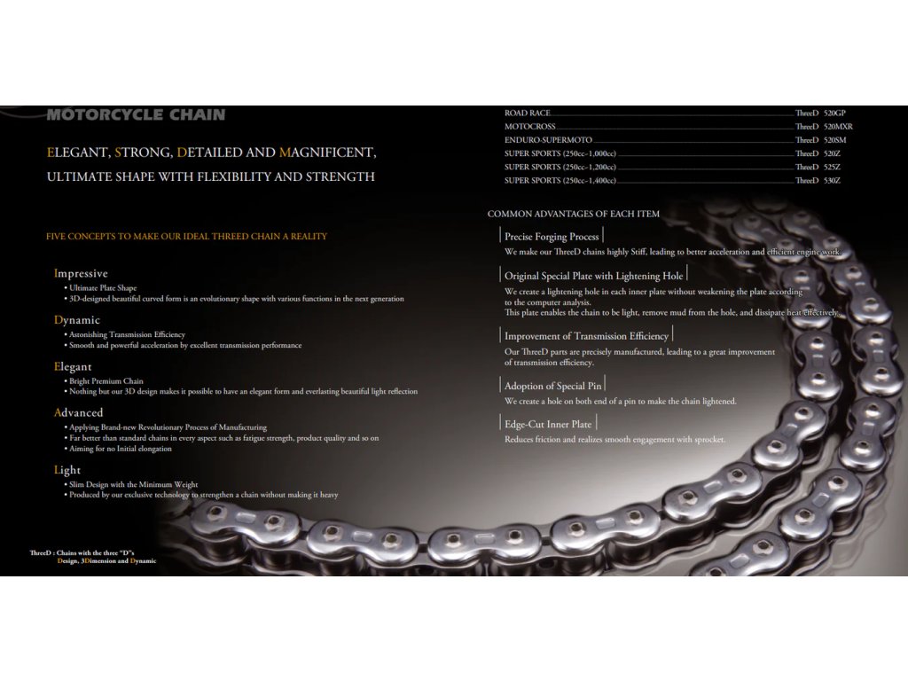 Řetěz EK ThreeD je výsledkem snahy vyrobit prémiový řetěz, který snižuje tření o 30 %, je mimořádně odolný, ale zároveň i esteticky propracovaný. Vnější destičky s elegantním zakřivením snižují hmotnost a zvyšují atraktivitu, zatímco vnitřní destičky a čepy s odlehčovacími otvory dále snižují celkovou hmotnost řetězu.
