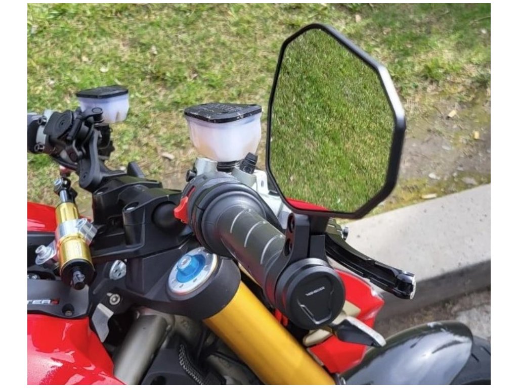 Strmé a ploché lichoběžníky tvoří základní tvar koncovek řídítek HIGHSIDER ESAGANO-LS obráběných CNC z hliníku a vytvářejí futuristický design, který tak symbolizuje designový styl moderních motocyklů. Vizuálním lákadlem je kryt, ve kterém je šestiúhelníkový základní tvar naší řady zrcátek ESAGANO-RS obráběn CNC. To dává koncovkám řídítek uzavřený vzhled bez koncové hlavy šroubu. Kryt je připevněn závitovým šroubem v neviditelné oblasti základního pouzdra. Konce řídítek ESAGANO-LS jsou vhodné pro montáž naší rozsáhlé řady zrcátek na koncovky řídítek s šířkou stonku 12 mm. Najděte si také opticky sladěná zrcátka pro váš motocykl. Díky našemu vysoce kvalitnímu a dodávanému systému objímek z hliníku lze konce řídítek namontovat na různá řídítka s různým vnitřním průměrem s nástrčným uchycením.