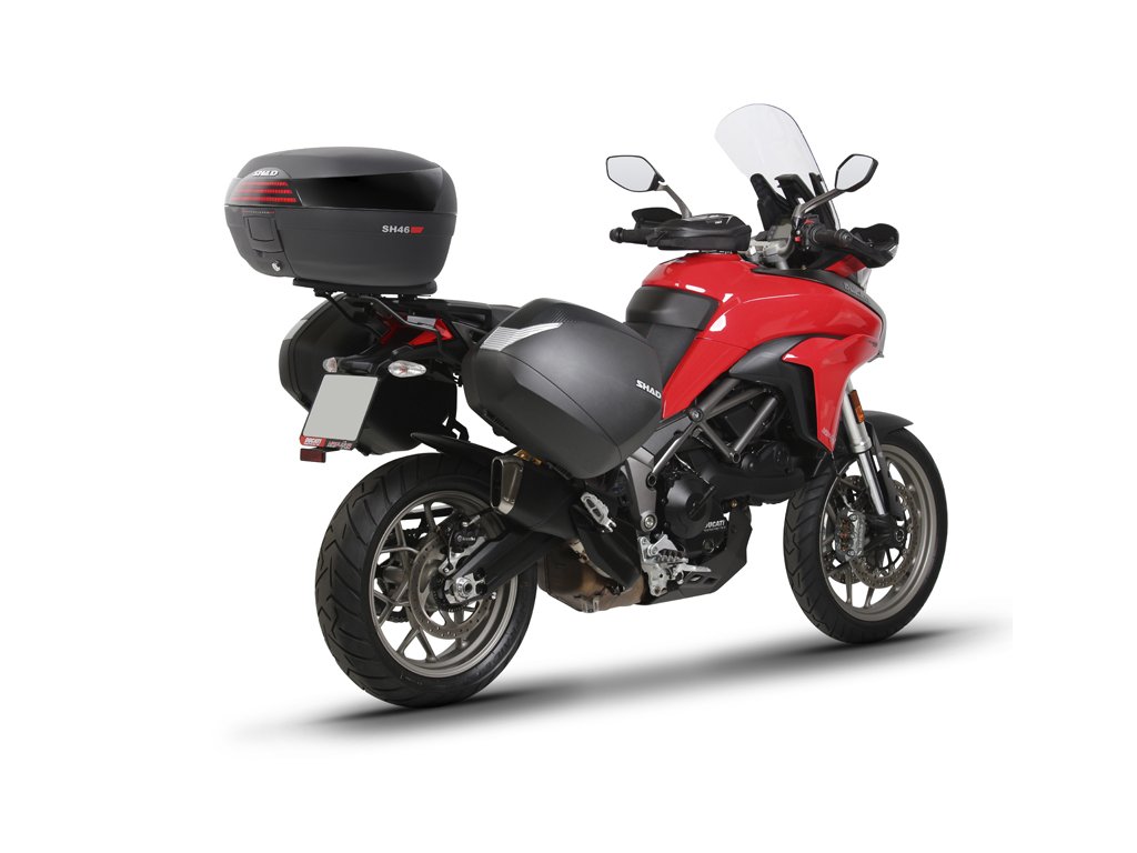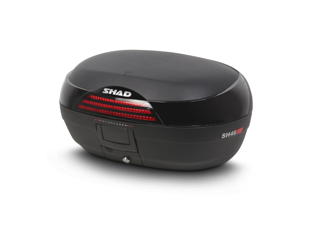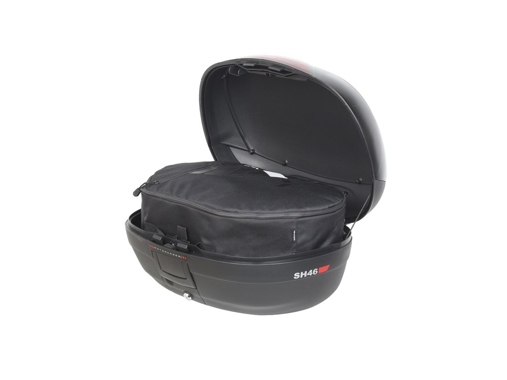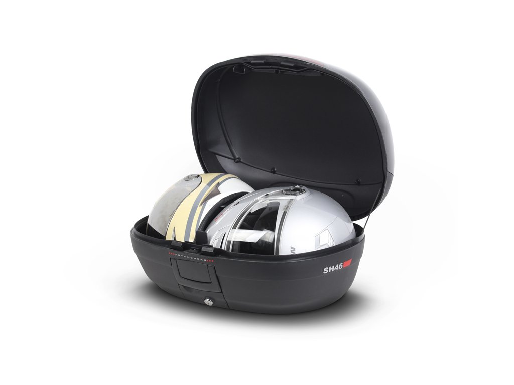 SH46 kufr s velkou kapacitou pro 2 helmy, vnitřní taška, opěrka, brzdové světlo a barevné kryty dostupné jako příslušenství, včetně plotny dodávané s kufrem.