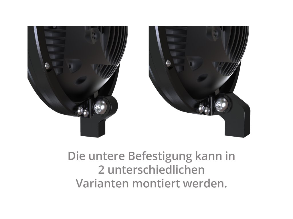 Součástí světlometu je černý hliníkový držák s bočním nebo spodním uchycením. Boční držáky lze namontovat ve třech polohách, spodní držáky lze namontovat ve třech polohách, díky tomu je montáž snadná a více variabilní.