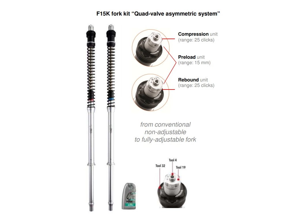 - F15K - F15K, základní kazeta se čtyřmi ventily, jedná se o asymetrickou hydraulickou kartuši, která zcela nahrazuje původní vnitřky běžných nenastavitelných vidlic a převádí je na plně nastavitelné jako u sportovní vidlice, sada určená pro všechny motocykly Street, Naked a Classic vybavená konvenčními vidlicemi, obsahuje předpětí pružiny a samostatné asymetrické nastavení tlumení komprese a odskoku pomocí inovativního „systému čtyř ventilů“, který zabraňuje riziku kavitace kapaliny, může být nastavena mnohem přesněji pro potřeby každého jezdce, díky čemuž je vidlice přesnější, lépe nastavitelná, snadněji použitelná… lepší v každém ohledu