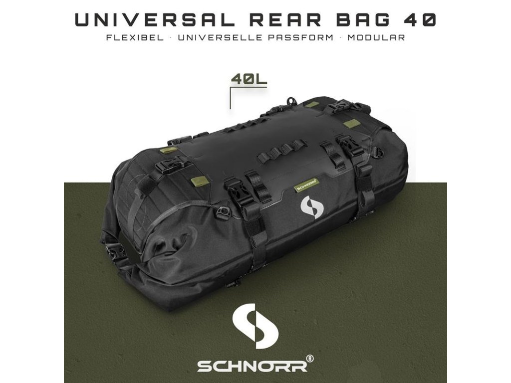Zadní motocyklová brašna SCHNORR Universal 40L. Univerzální vodotěsné zavazadlo typu „Rearbag“ s tunelovou konstrukcí a oboustranným přístupem. Určeno pro montáž na sedadlo spolujezdce nebo zadní nosič motocyklu.
